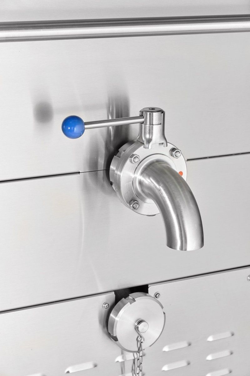 Аппарат изготовлен из качественной нержавеющей стали и не требуют трудоемкого ухода. В модели предусмотрены два сливных крана: один соответствует для слива полезного объема закваски, другой позволяет целиком опустошать емкость.