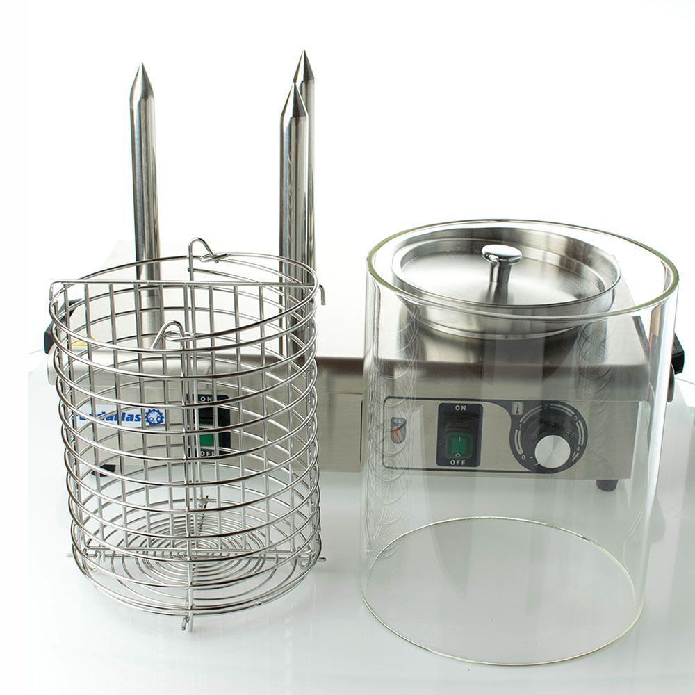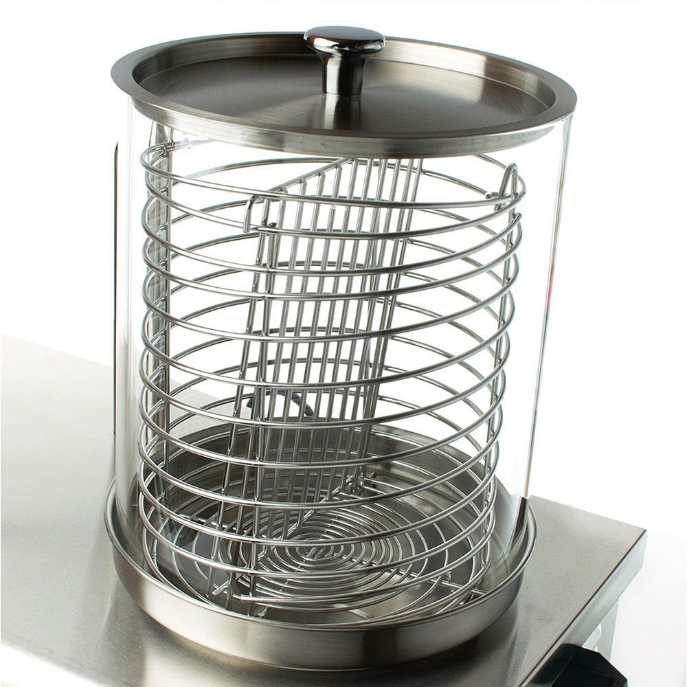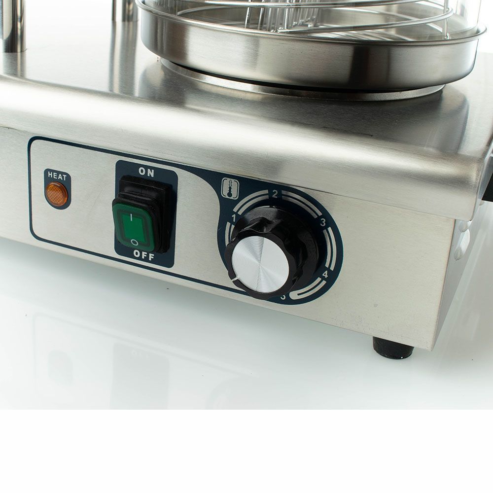 Принцип работы аппарата: булочка насаживается на стержень, подогревается, далее в булку укладывается сосиска. Колпак с крышкой позволяет поддерживать заданную температуру булок и сосисок.