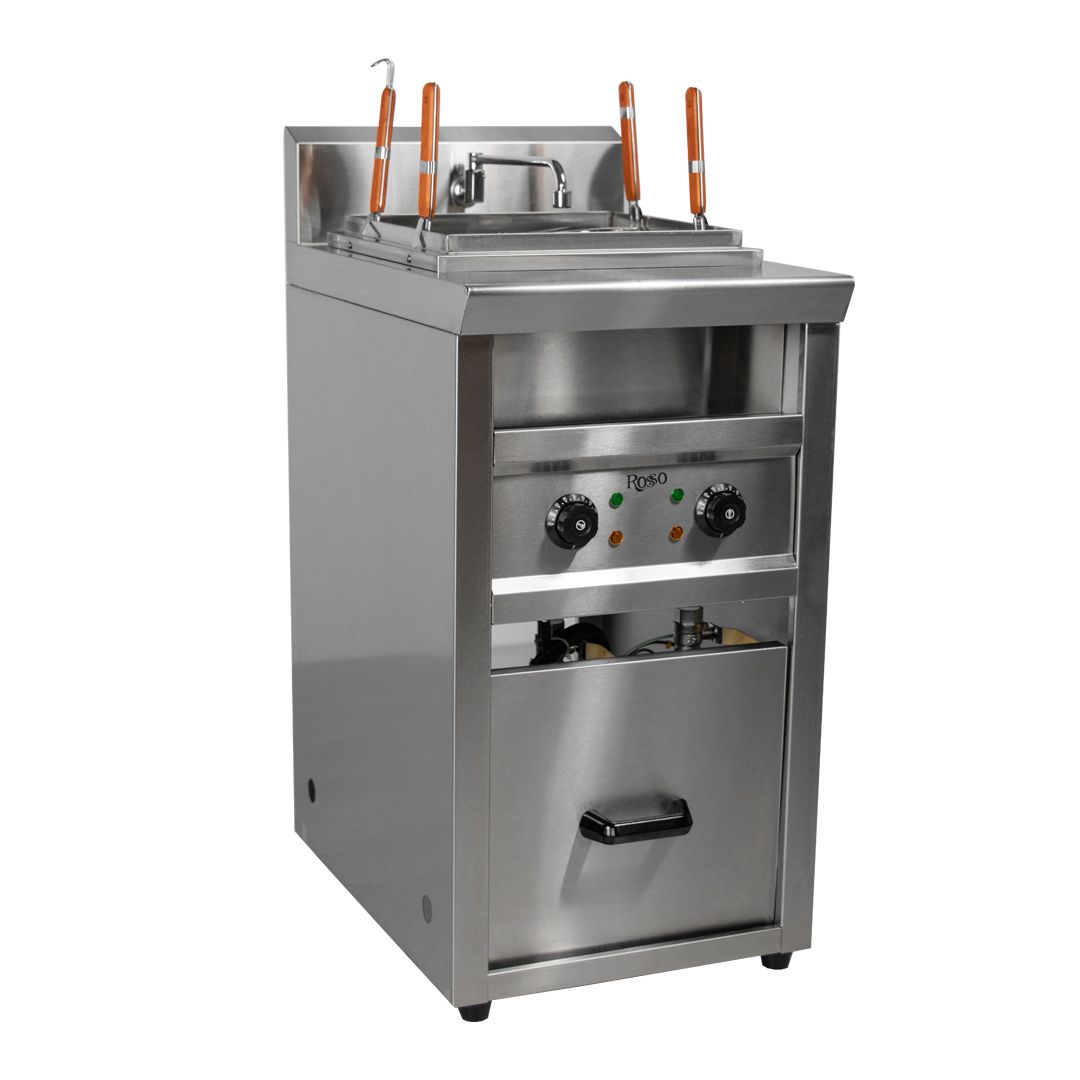 Макароноварка HEN-4HX производства Rosso (Китай) - профессиональная электрическая макароноварка для предприятий общественного питания, кафе и заведений быстрого питания. Аппарат предназначен для быстрой варки макаронных изделий, пельменей, вареников, риса, овощей, сосисок, яиц и креветок. Четыре независимые секции с отдельными корзинами позволяют одновременно готовить разные блюда без смешивания вкусов - ключевое преимущество при работе на горячей линии в часы пик. Корпус выполнен из пищевой нержавеющей стали, аппарат подключается к водопроводу и оснащён краном для налива воды на верхней поверхности.