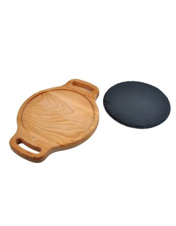 Блюдо для подачи d=25см h=1,5см черное сланец на дерев. подставке с ручками производства MGprof
