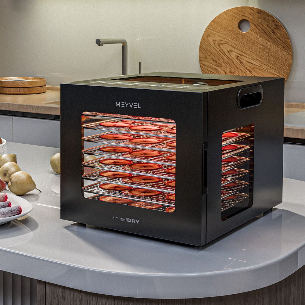 Дегидратор MDH8-1S (черный) производства Meyvel (Италия) - практичное решение для приготовления сушёных фруктов, овощей, мяса, зелени и домашних снеков без добавления консервантов и сахара. Подходит как для домашней кухни, так и для малого бизнеса (кафе, фермерских хозяйств, точек продажи ЗОЖ-продуктов). Сочетание продуманной конструкции, интуитивного управления и надёжности делает его незаменимым помощником в сохранении натурального вкуса и пользы продуктов.