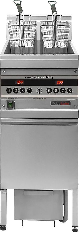 Фритюрница RoboFry RF производства ТТМ RoboLabs (Россия) - профессиональная электрическая фритюрница с системой фильтрации масла, программируемым контроллером RoboTron и закрытой подставкой. Модель предназначена для приготовления различных продуктов в большом количестве масла на предприятиях общественного питания и торговли. Корпус выполнен из нержавеющей стали AISI 430. В комплект поставки входят 2 корзины из нержавеющей стали и 10 бумажных фильтров.