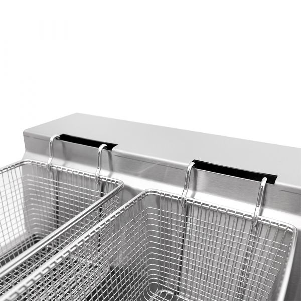 Фритюрница RoboFry RF2 производства ТТМ RoboLabs (Россия) - профессиональная электрическая фритюрница с системой фильтрации масла, программируемым контроллером RoboTron и закрытой подставкой. Модель оснащена двумя ваннами объёмом по 12 литров каждая, что позволяет одновременно готовить разные продукты или увеличивать общий выпуск на точке. Конструкция изготовлена из нержавеющей стали AISI 430. В комплект поставки входят 2 корзины из нержавеющей стали и 10 бумажных фильтров.