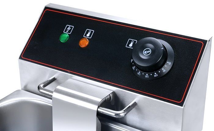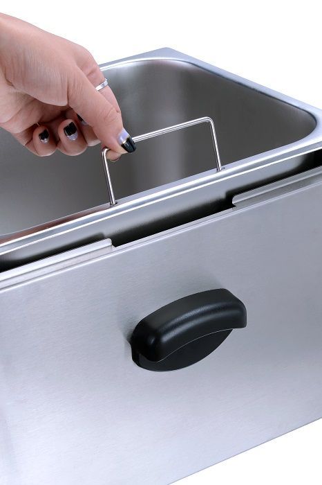 Корпус и ванна изготовлены из нержавеющей стали, съемная корзина - из нержавеющей проволоки, ручки корзины - из термоустойчивого пластика. Оборудована терморегулятором, есть функции автоотключения по достижению заданной температуры и включения при понижении заданной температуры.
