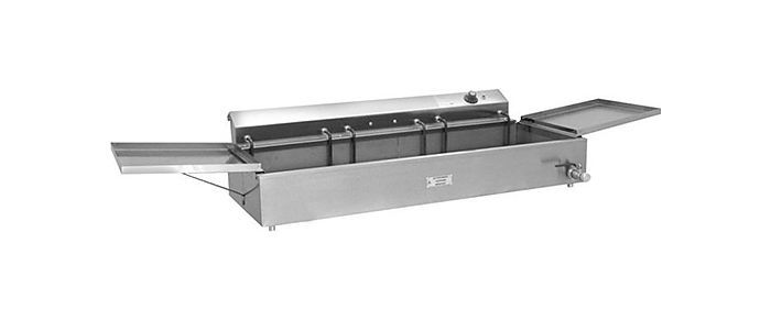 - к рабочей ванне при помощи распорок присоединяются откидные крышки-полки, которые являются крышками при неработающей фритюрнице, а при работе - полками для готового продукта;