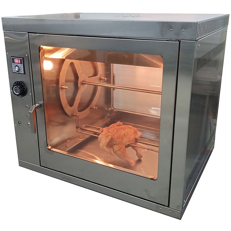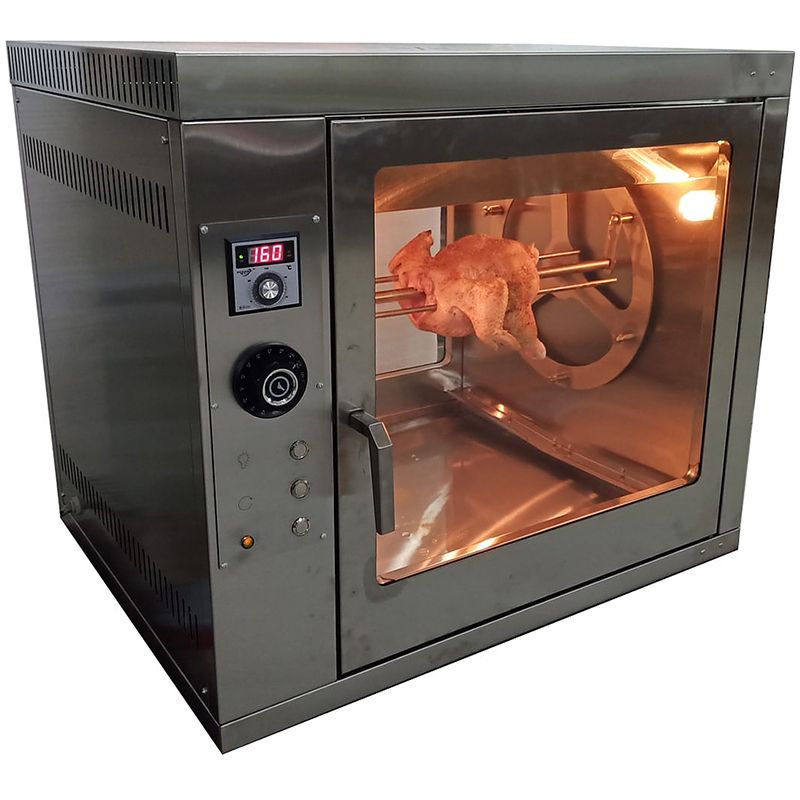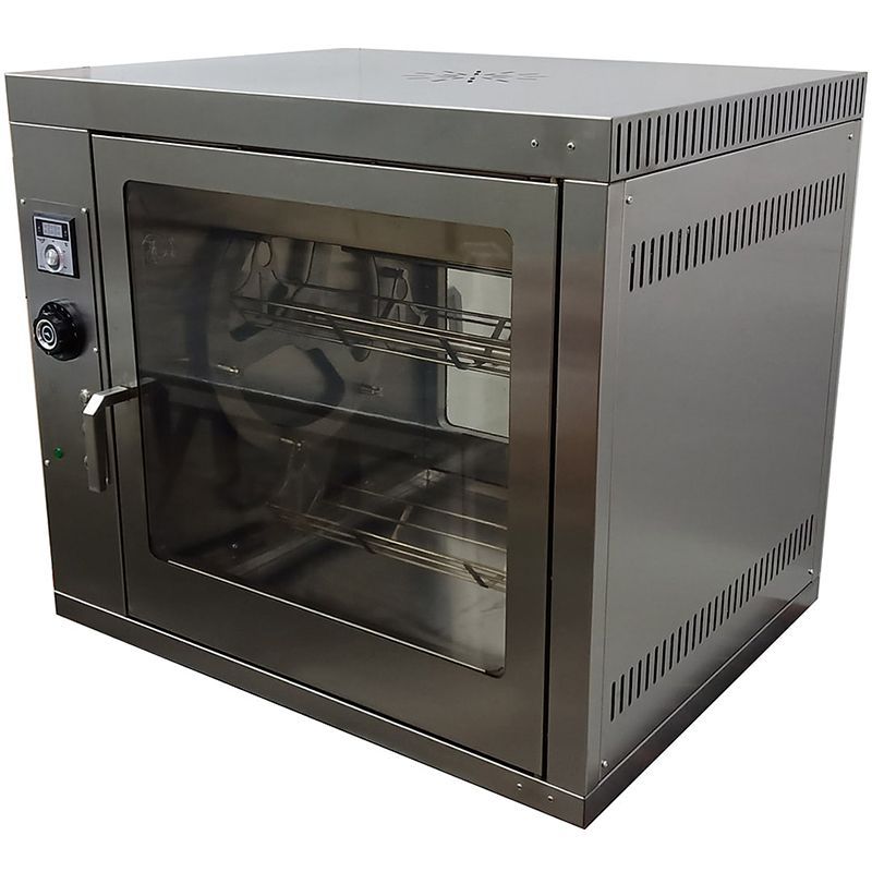 Изделие выполнено из нержавеющей стали, двери - из жаростойкого стекла. Модель оснащена терморегулятором с цифровым табло, подсветкой, поддоном и ванночками для сбора жира.