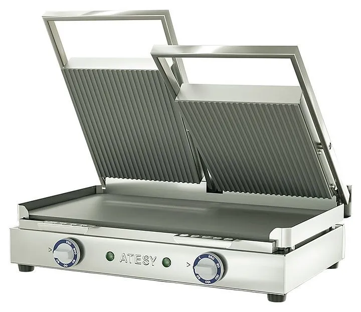 Гриль имеет греющие поверхности: две независимые верхние - ребристые, общая нижняя – гладкая. Контактируя с продуктом в процессе приготовления, они помогают достичь более равномерной и быстрой прожарки. Блюдо готовится без потери жара, который мгновенно проникает вглубь продукта, идеально прожаривая его. На выходе появляется характерная золотистая корочка и рифлёный рисунок.