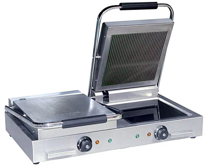 Материал корпуса – пищевая нержавеющая сталь. Имеет две рабочих зоны, жарочные поверхности из стеклокерамики. Давление верхней поверхности регулируется автоматически, что подойдет для различной толщины продукта.