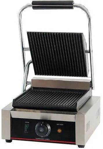 Односекционный контактный гриль для обжарки бургеров, котлет, стейков и других продуктов. Может быть использован для приготовления различных популярных блюд фастфуда. Рабочие пластины модели выполнены из сплава чугуна. Для простоты и удобства управления в данном аппарате используется аналоговая панель.