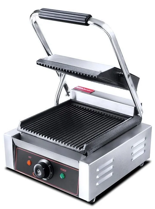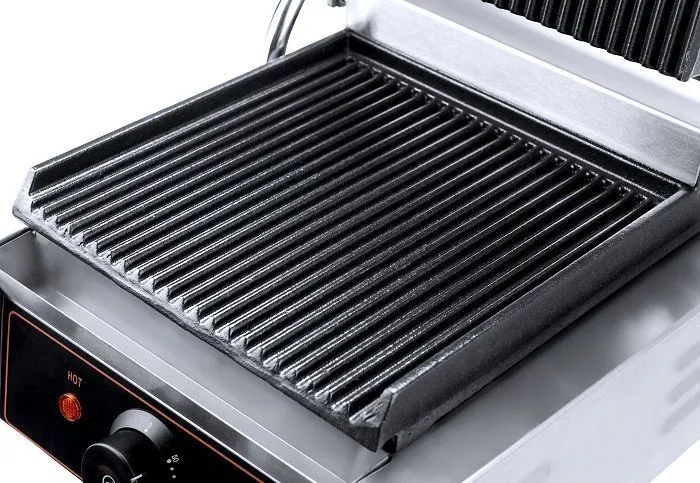 Материал корпуса – пищевая нержавеющая сталь. Имеет одну рабочую зону, жарочная поверхность из чугуна. Давление верхней поверхности регулируется автоматически, что подойдет для различной толщины продукта.