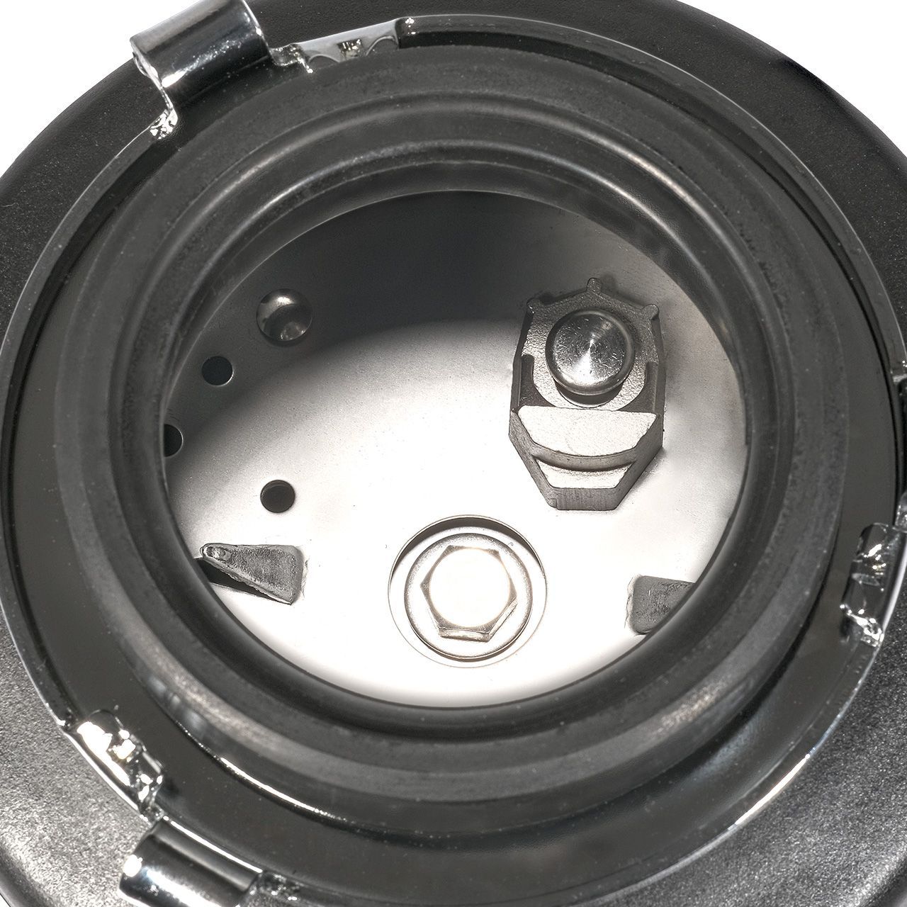 Камера измельчения. Терка по кругу камеры измельчения изготовлена из нержавеющей стали. Материал камеры измельчения выполнен из прочного композитного материала. Измельчитель имеет три ступени дробления, способен дробить кости. Попадая в измельчительную камеру, пищевые отходы разбиваются на более мелкие фрагменты, перетираются в водянистую кашу, которая легко и безопасно смывается в канализацию.