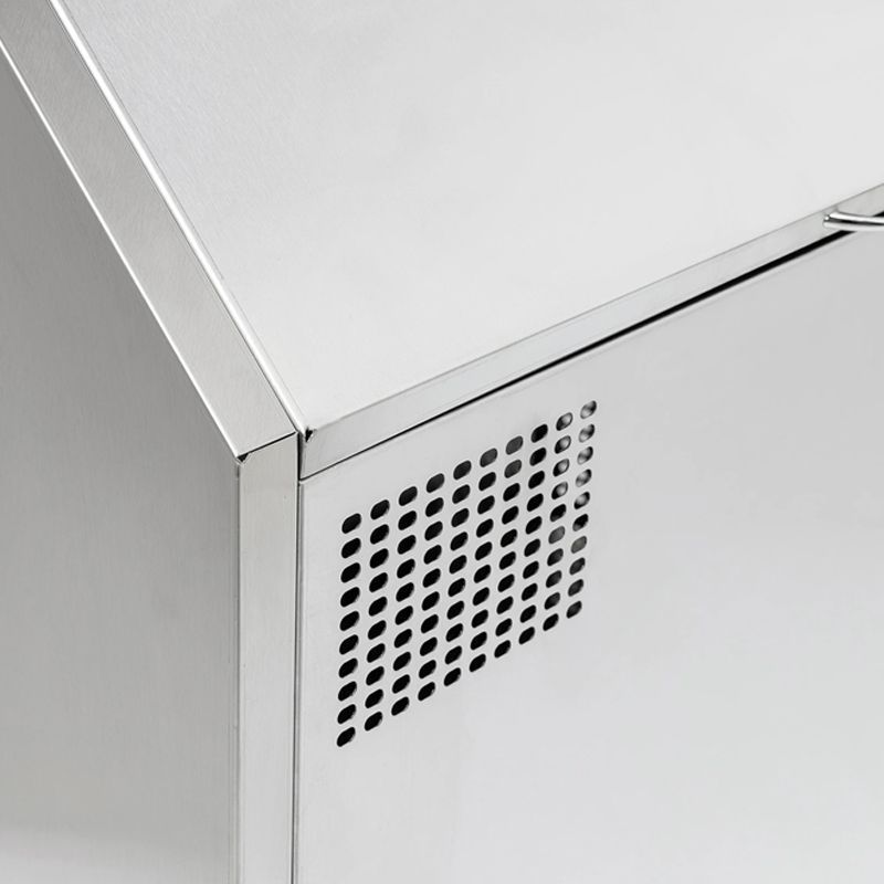 Изделие выполнено из нержавеющей стали, не поддается коррозии. Модель оснащена вентиляционными отверстиями и обеспечивает размещение и хранение любых овощей.
