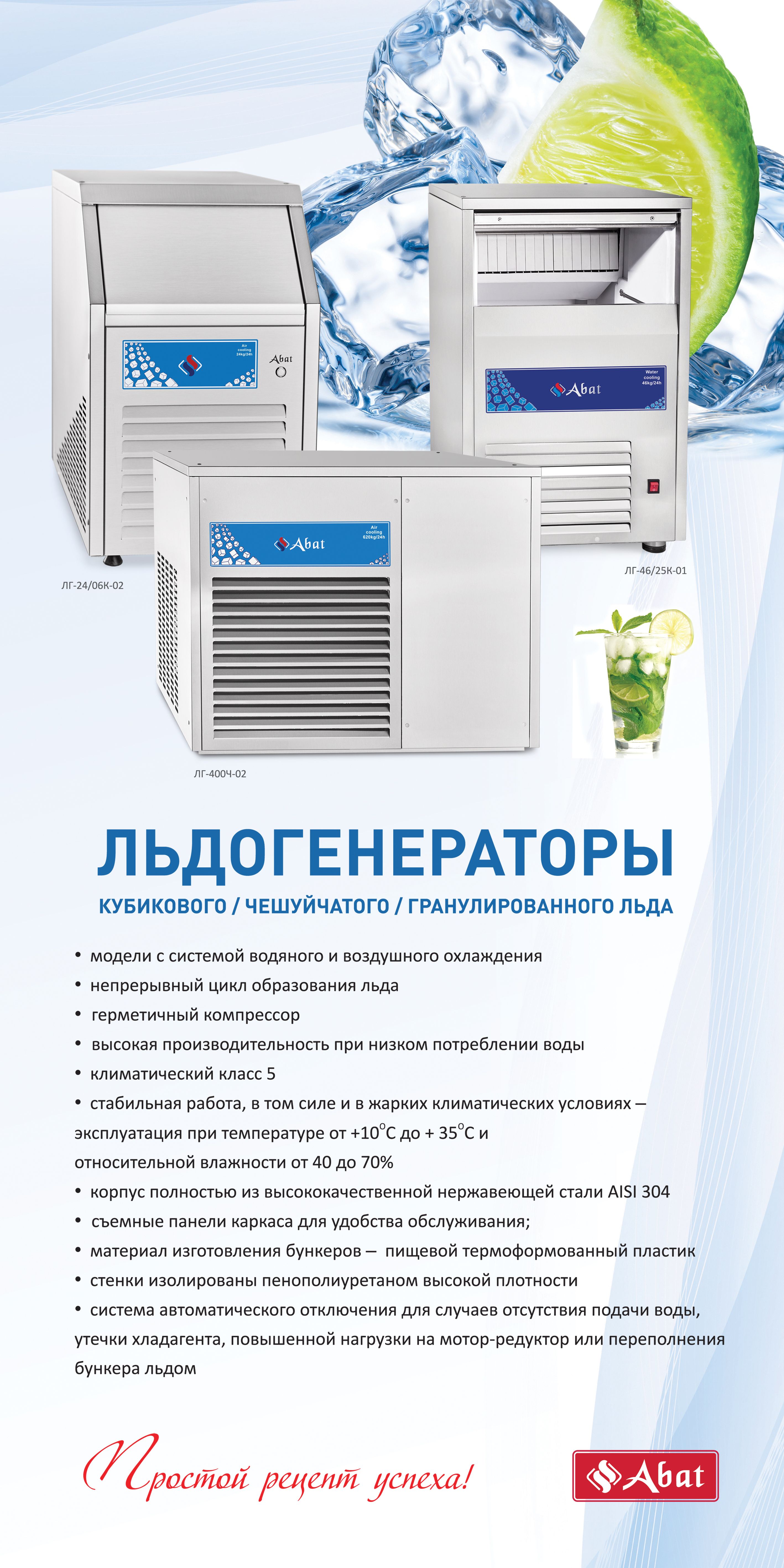 Льдогенератор ЛГ-64/40К-01 производства Abat (Чувашторгтехника) предназначен для охлаждения воды и формирования кубиков льда гурме (Gourmet Ice). Целевое использование на предприятиях общественного питания.