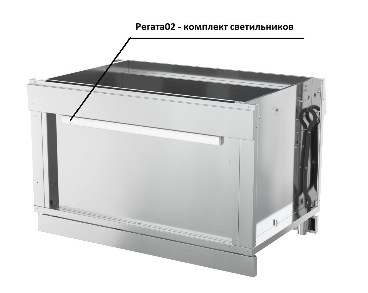 Комплект светильников Регата02 КСВ-1670-02 производства АТЕСИ (Россия) предназначен для подсветки передней панели тумбы-подставки ТПХ-1670-02 линии раздачи Регата. На каждый модуль можно установить 1 или 2 комплекта светильников.