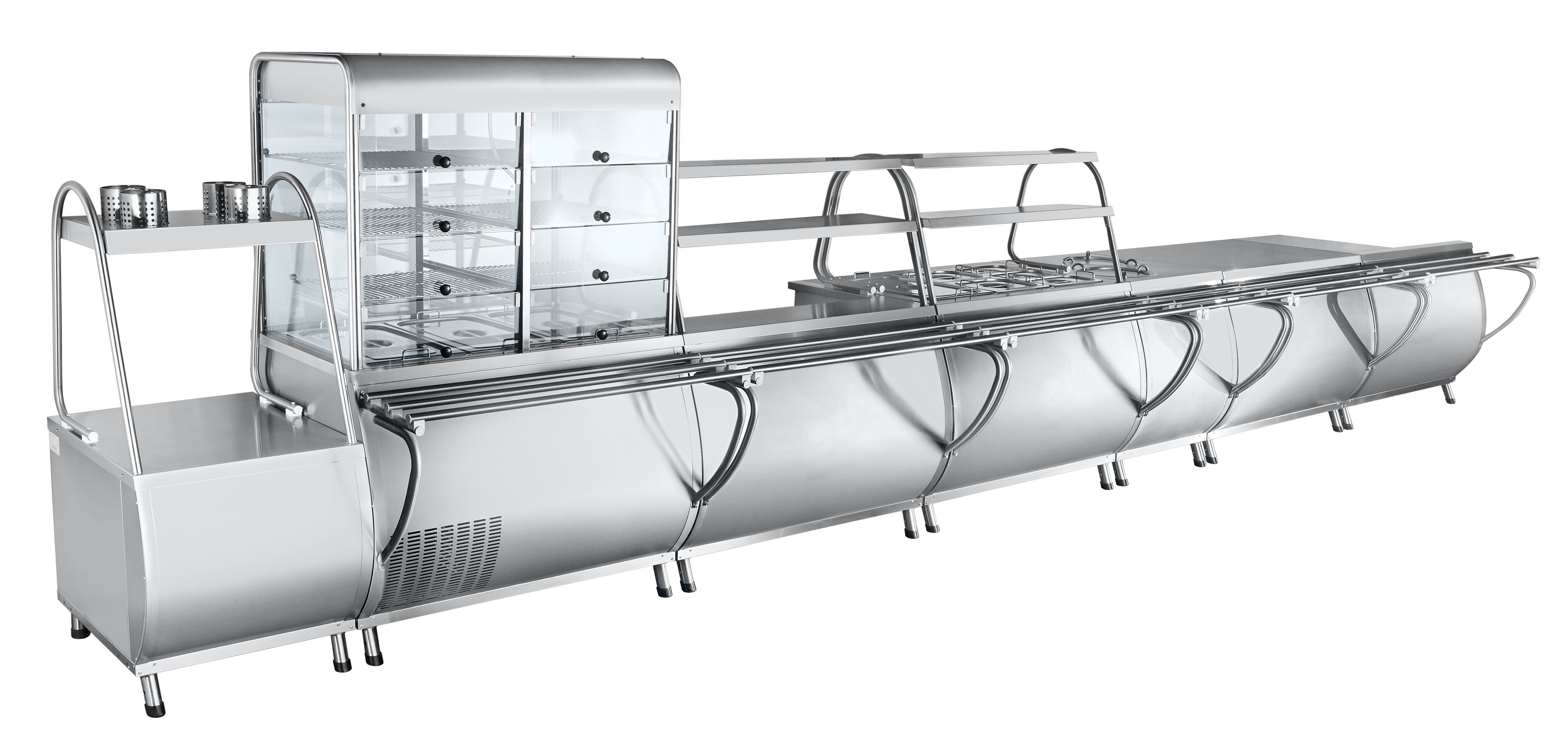 - Большой выбор модулей, таких как мармиты для первых и вторых блюд, тепловые и холодильные витрины, прилавки для подогрева тарелок, кассовые кабины, а также прилавки для столовых приборов и подносов.