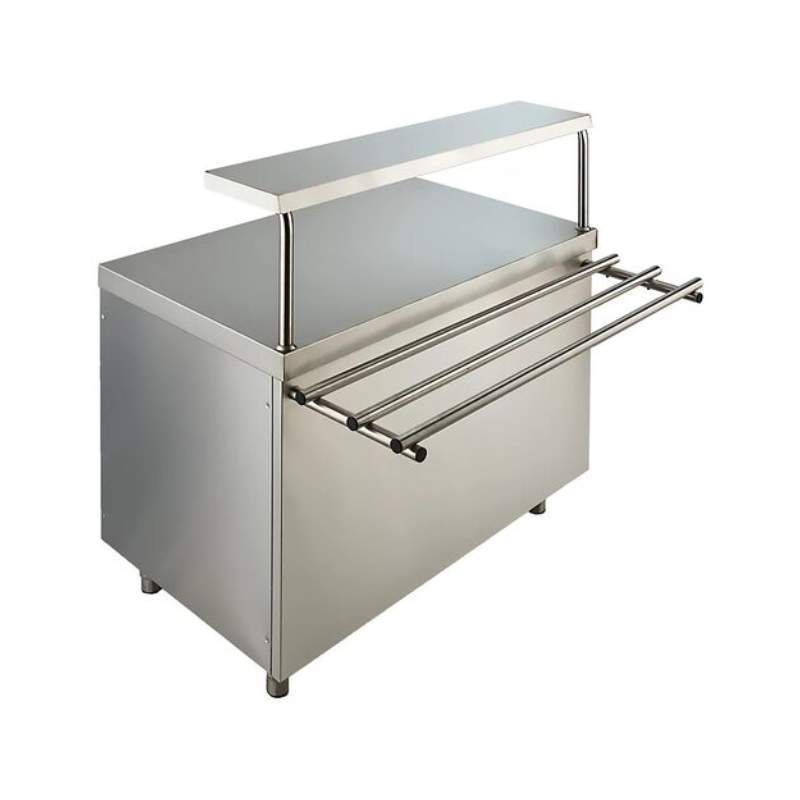 Столешница и полка выпонены из нержавеющей стали AISI 304, боковые и передние панели - из окрашенной в серый цвет оцинковки. Модель используется в составе линии раздачи.