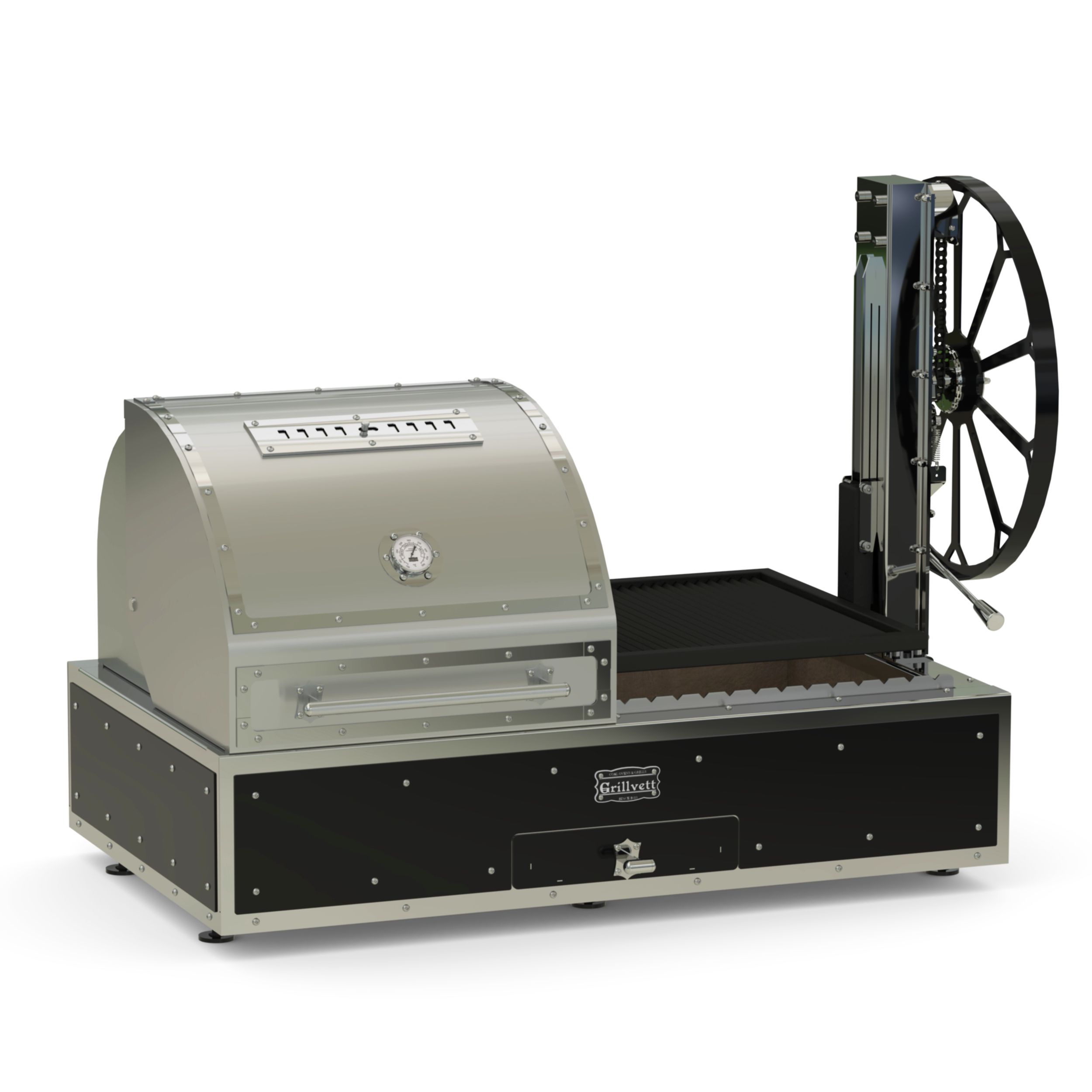 Гриль угольный Corvette MS производства GrillVett (Россия) - многофункциональный настольный угольный гриль с крышкой-смокер, очагом из шамотной плиты и регулируемой штурвалом решёткой-гриль. Модель сочетает функции открытого гриля, смокера и мангала в одном аппарате, заменяя несколько устройств на кухне. Стейковая зона, мангальная зона со статичной решёткой и встроенный аналоговый термометр позволяют одновременно готовить европейские и кавказские блюда. Цвет корпуса - черный (возможна покраска в любой цвет по каталогу RAL Classic).