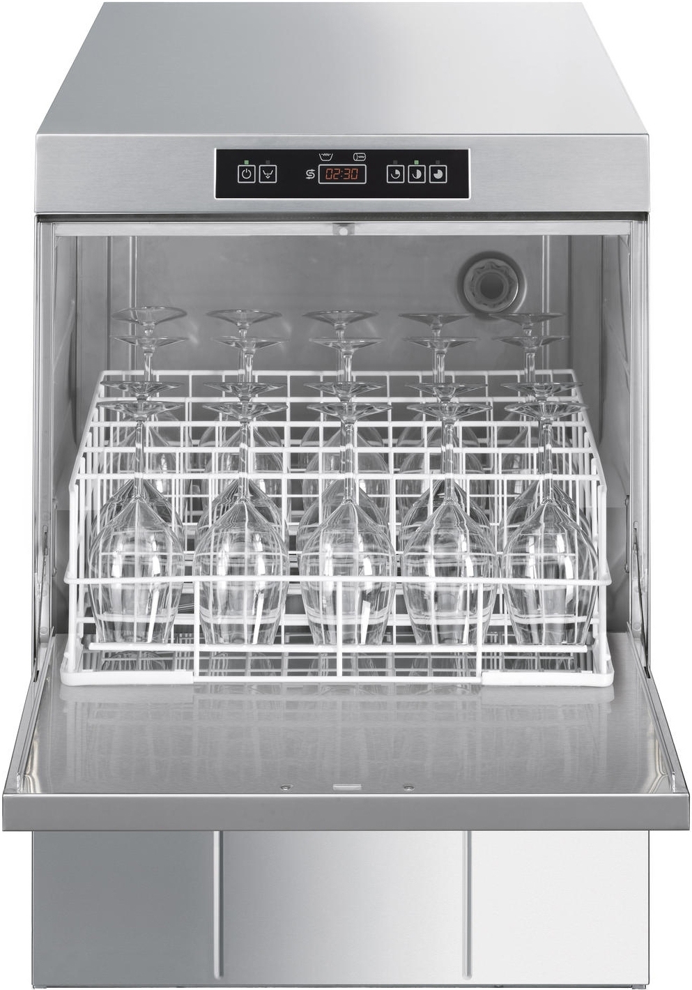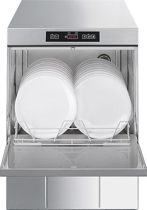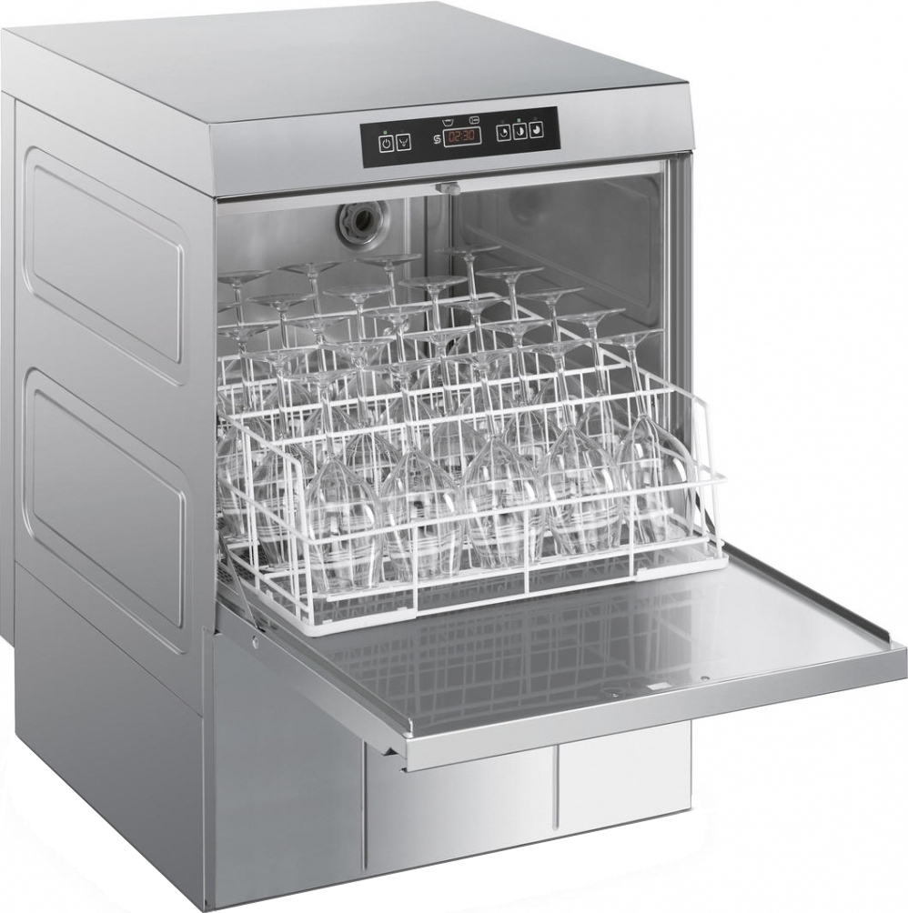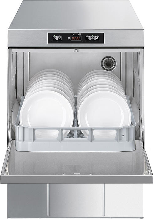Профессиональная посудомоечная машина фронтальной загрузки UD505DS серии ECOLINE для кассет 500х500 мм, встроенная система HTR, встроенный водоумягчитель производства Smeg (Италия).