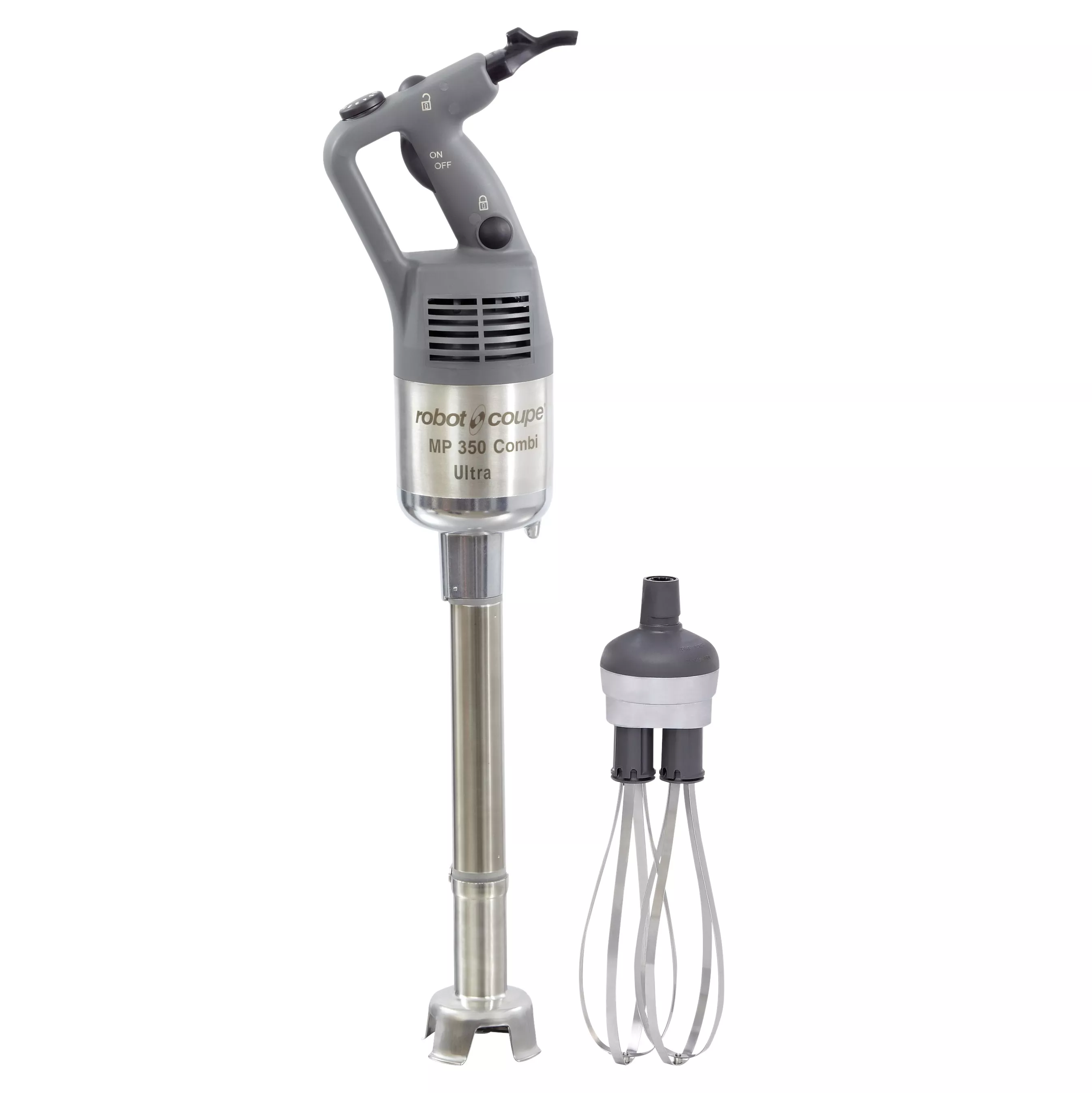 Миксер ручной Робот Куп MP 350 Combi Ultra (34860L) производства Robot Coupe (Франция) - профессиональный погружной миксер серии «макси‑комби» (блендер Robot Coupe + миксер) для приготовления супов‑пюре, картофельного и овощного пюре, соусов, муссов, майонеза, взбивания белков, сливок и замешивания жидкого теста на предприятиях общественного питания: в ресторанах, столовых, на фабриках‑кухнях и пищевых производствах.