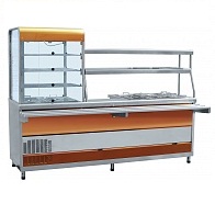 Холодильная витрина, входящая в состав, оснащена компрессорной системой охлаждения с встроенным вентилятором для принудительной циркуляции охлажденного воздуха внутри камеры. Это обеспечивает равномерное охлаждение по всей рабочей камере, создавая оптимальные условия хранения продуктов на разных уровнях. Плавное регулирование температуры осуществляется с помощью поворотных ручек. Витрина оборудована несколькими решетчатыми полками и гастроемкостями, расположенными в нижней части, а также подъемной дверцей, обеспечивающей максимальное удобство для покупателей.