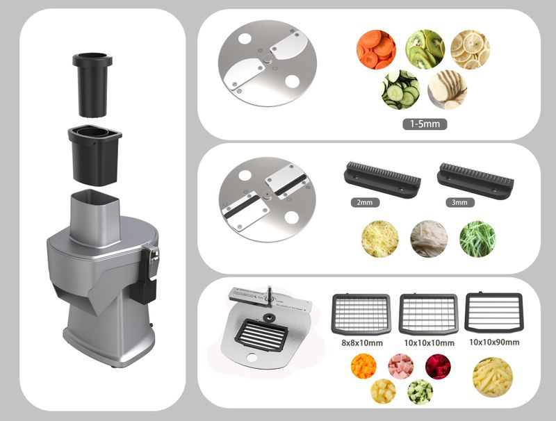 - Виды нарезки: ломтики 1-5 мм, терка 2 мм, терка 3 мм, кубик 8x8x10 мм, кубик 10x10x10 мм, брусок 10x10x90 мм;