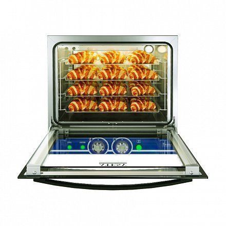 Печь без пароувлажнения. Корпус и камера печи выполнены из нержавеющей стали. Дверца печи изготовлена из термостойкого стекла. Электромеханическое управление. Имеется возможность регулировки температуры и времени приготовления. Оснащена системой безопасности, с автоматической остановкой работы вентиляторов, в случае открытия двери. Подсветка.