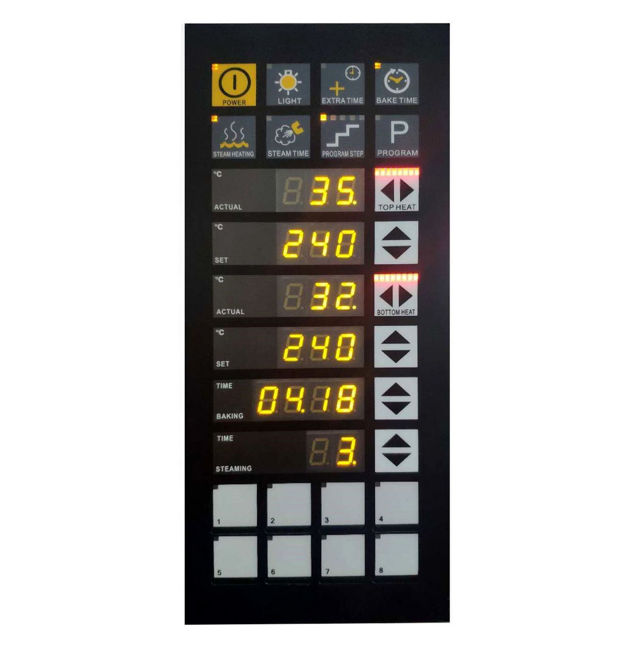 Электронная панель управления индивидуальное программирование на 8 программ (до 5 шагов в каждой) позволяет устанавливать температуру в зоне верхних и нижних ТЭНов в интервале от 20 до 380°C, регулировать мощность этих ТЭНов с шагом 12,5 % и момент и длительность подачи пара.
