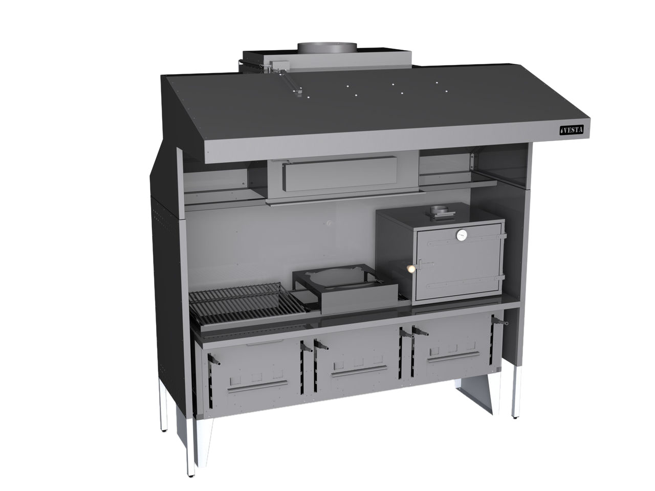 Комплекс K3-V3 производства Веста (Россия) - многофункциональное решение на базе увеличенного открытого мангала Vega 3 с подставкой под казан и общей системой вытяжки и искрогашения.