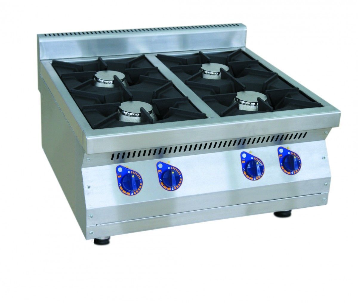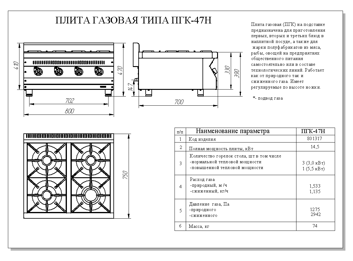 Плита газовая Abat ПГК-47Н производства Чувашторгтехника (Россия) предназначена для варения, жарения и тепловой обработки продуктов на предприятиях общественного питания. Материал корпуса - нержавеющая сталь. Плита оснащена четырьмя газовыми горелками, выполненными из чугуна. Три горелки нормальной тепловой мощности - 3 кВт, одна повышенной - 5,5 кВт. В газовой плите установлена система «газ-контроль», которая обеспечивает экономное расходование газа и безопасность эксплуатации.