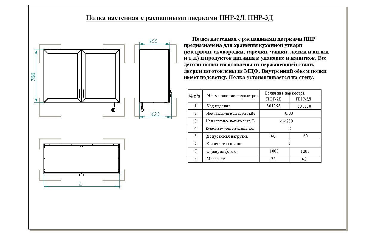 Полка ПНР-3Д производства Abat (Чувашторгтехника) - настенная полка с двумя распашными дверками, подойдет для производственных кухонь и в заведений общественного питания. Предназначена для хранениях посуды и сухих продуктов питания.