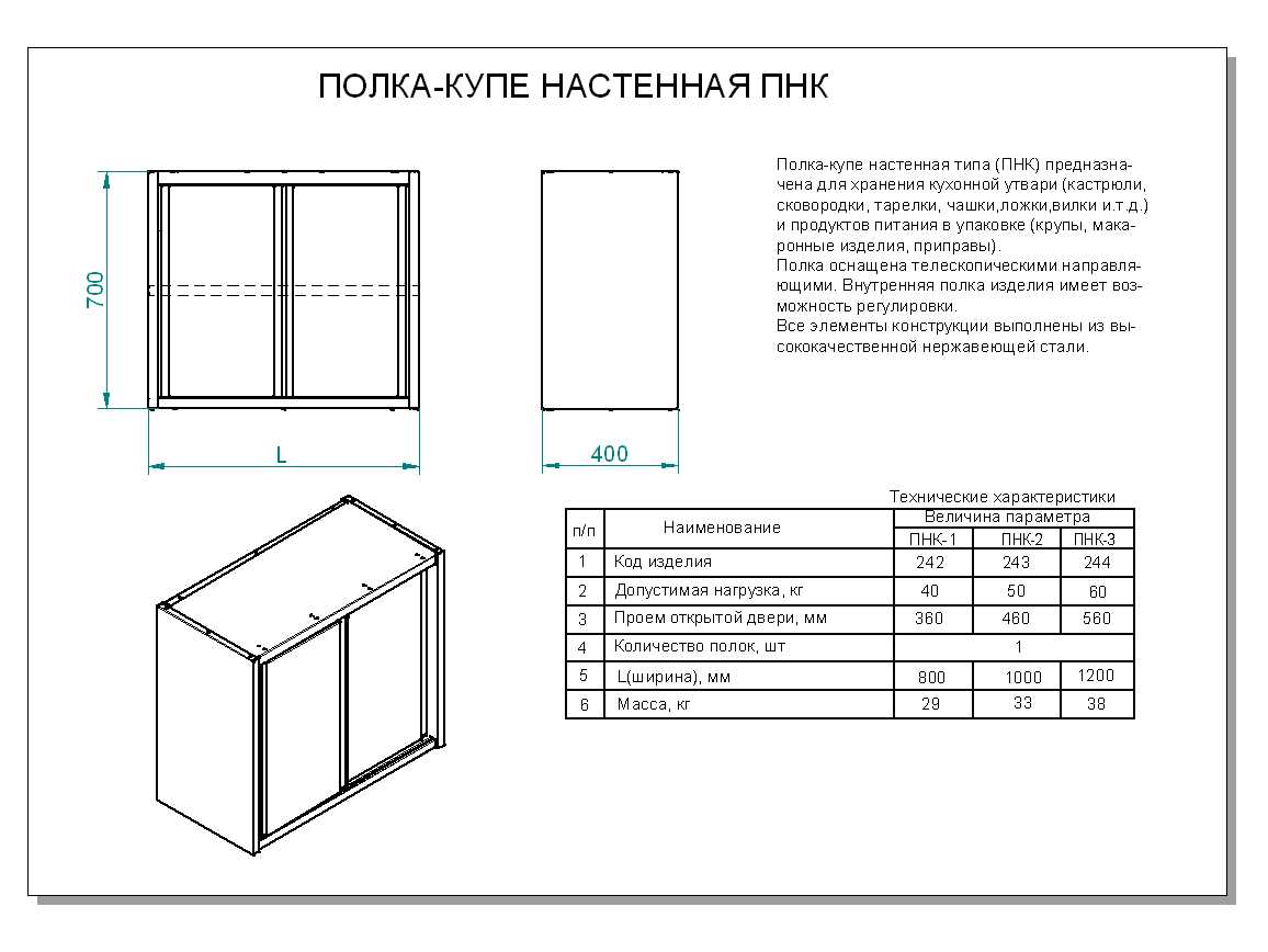 Конструкция разборная, выполнена из нержавеющей стали. Внутренняя полка имеет возможность регулировки, оснащена телескопическими направляющими. Выдерживает нагрузку до 60 килограмм.