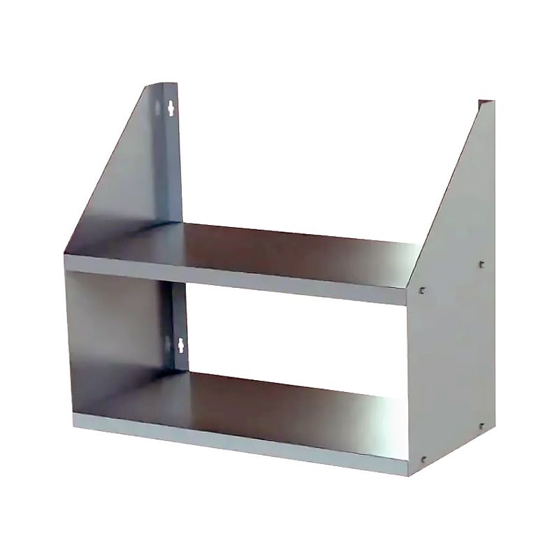 Изделие выполнено из нержавеющей стали AISI 430, усиление полки (ребро жесткости) - из оцинкованной стали. Модель оснащена 2 уровнями и имеет разборную конструкцию и косыми бобовыми упорами.