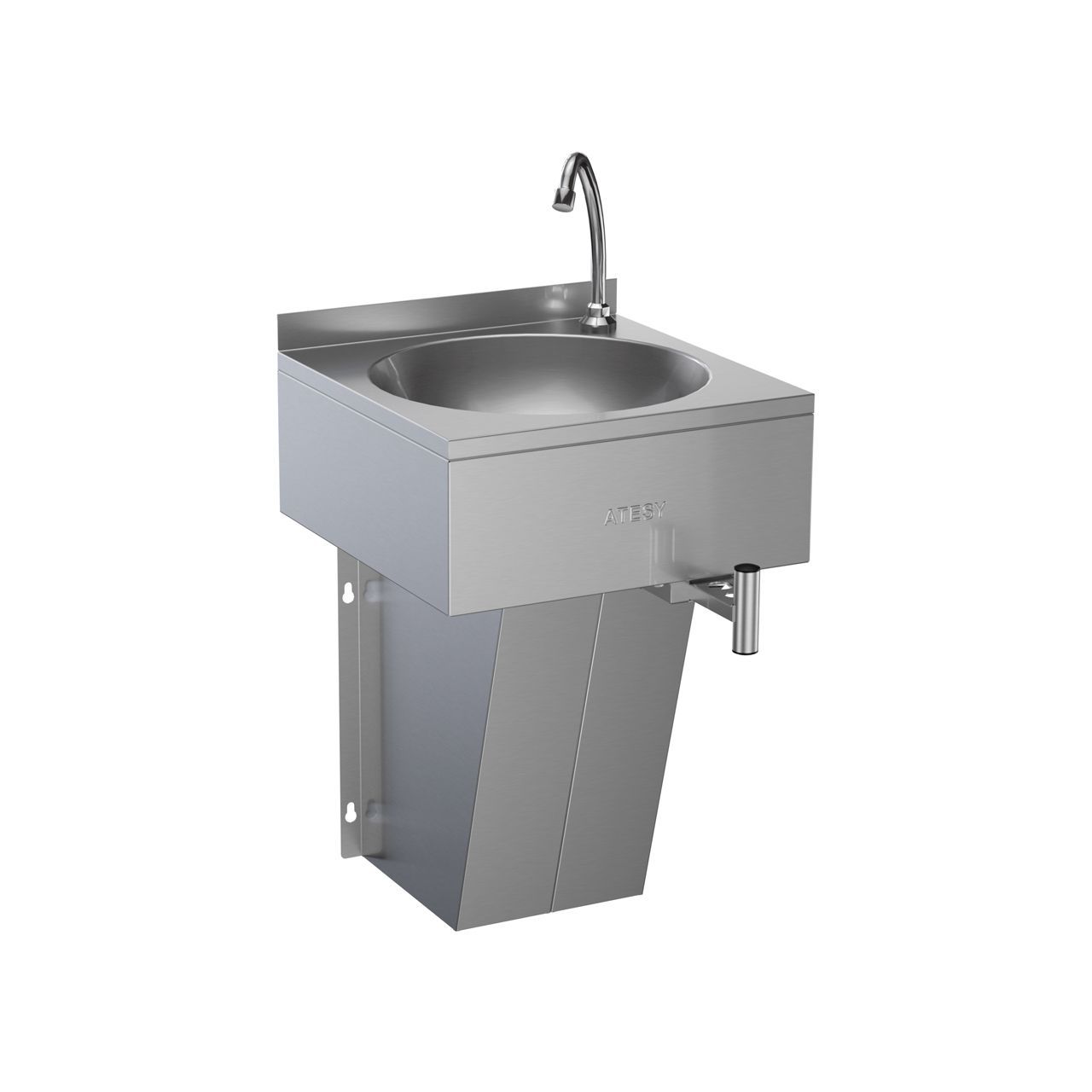 Рукомойник Atesy выполнен из нержавеющей стали марки AISI 304 толщиной 0,8 мм. Имеет борт и смеситель, так же укомплектован сливным сифоном с гидрозатвором. Размещается на стене с подключением к водопроводной сети и канализации. Подача воды осуществляется с помощью поворотного механизма для регулирования напора воды.