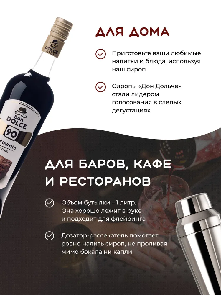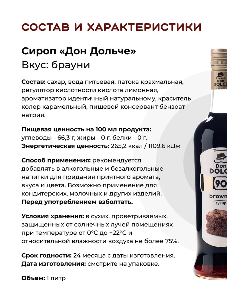 Сироп Дон Дольче Брауни (1л) производства Don Dolce (Россия) используется для придания аромата и вкуса в лимонадах, мороженого, горячих напитков, алкогольных и безалкогольных коктейлей. Подходит для различных предприятий общественного питаний, кофеен, ресторанов, баров и домашнего использования.