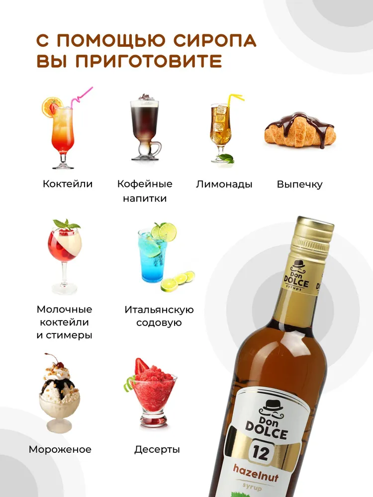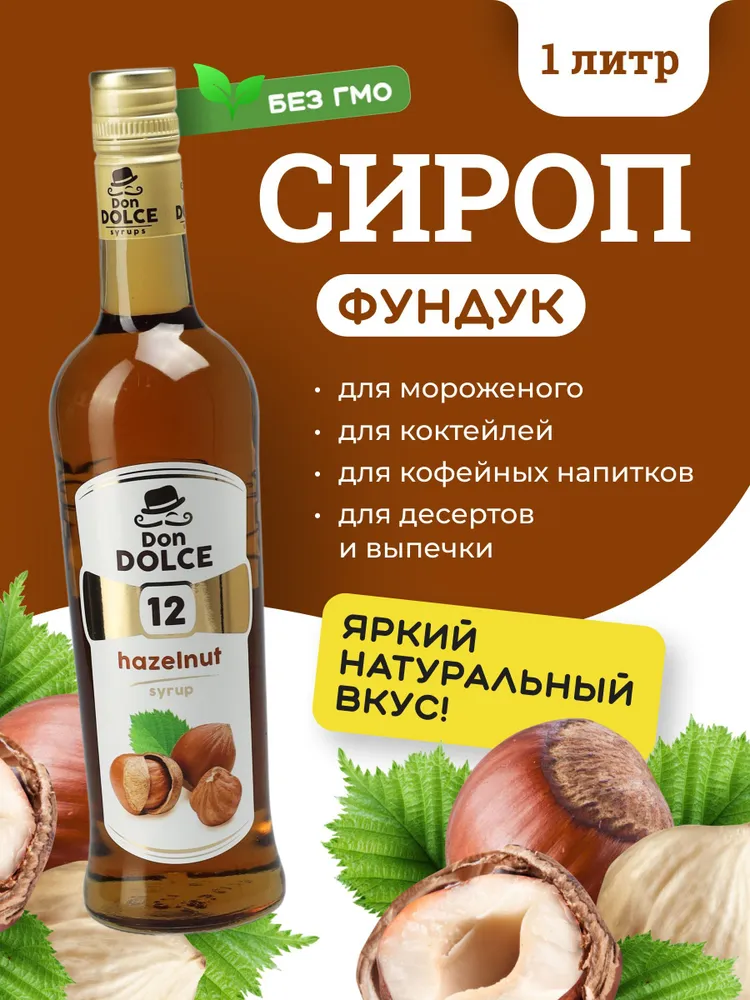 Сироп Дон Дольче Фундук (1л) производства Don Dolce (Россия) используется для придания аромата и вкуса в лимонадах, мороженого, горячих напитков, алкогольных и безалкогольных коктейлей. Подходит для различных предприятий общественного питаний, кофеен, ресторанов, баров и домашнего использования.