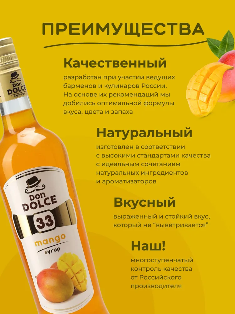 Сироп Дон Дольче Манго (1л) производства Don Dolce (Россия) используется для придания аромата и вкуса в лимонадах, мороженого, горячих напитков, алкогольных и безалкогольных коктейлей. Подходит для различных предприятий общественного питаний, кофеен, ресторанов, баров и домашнего использования.