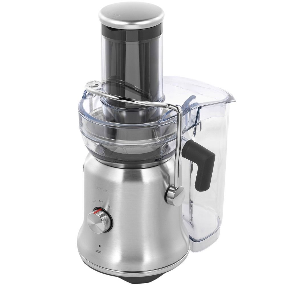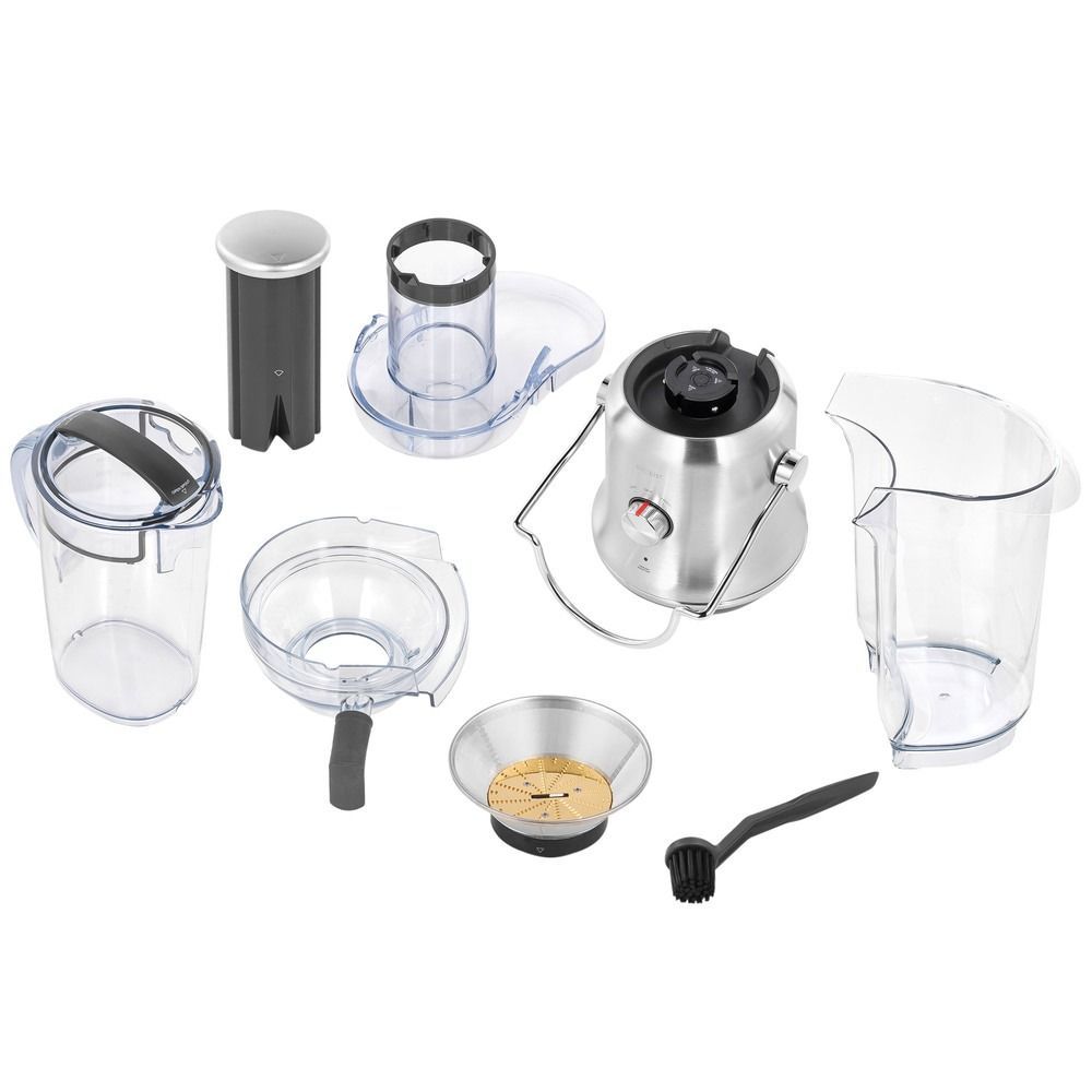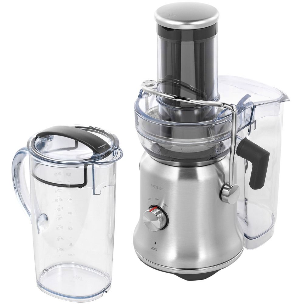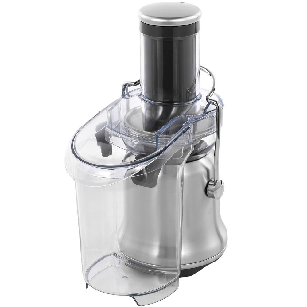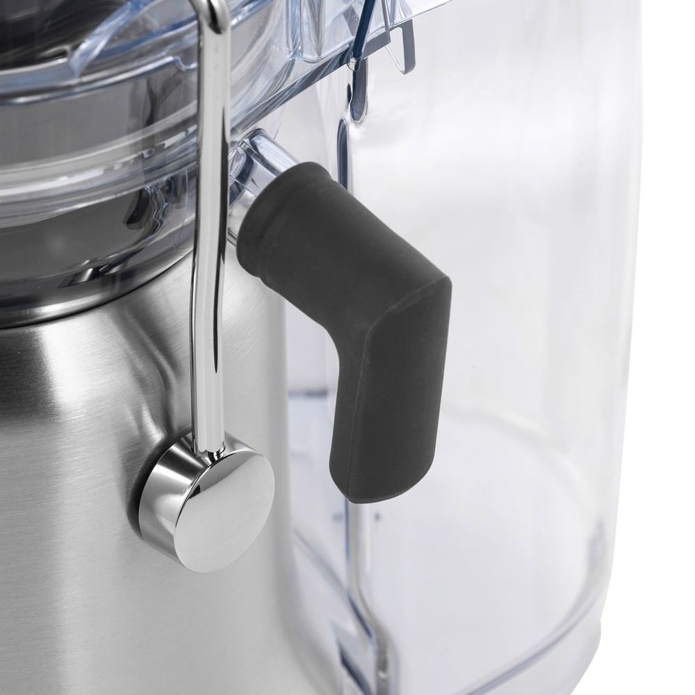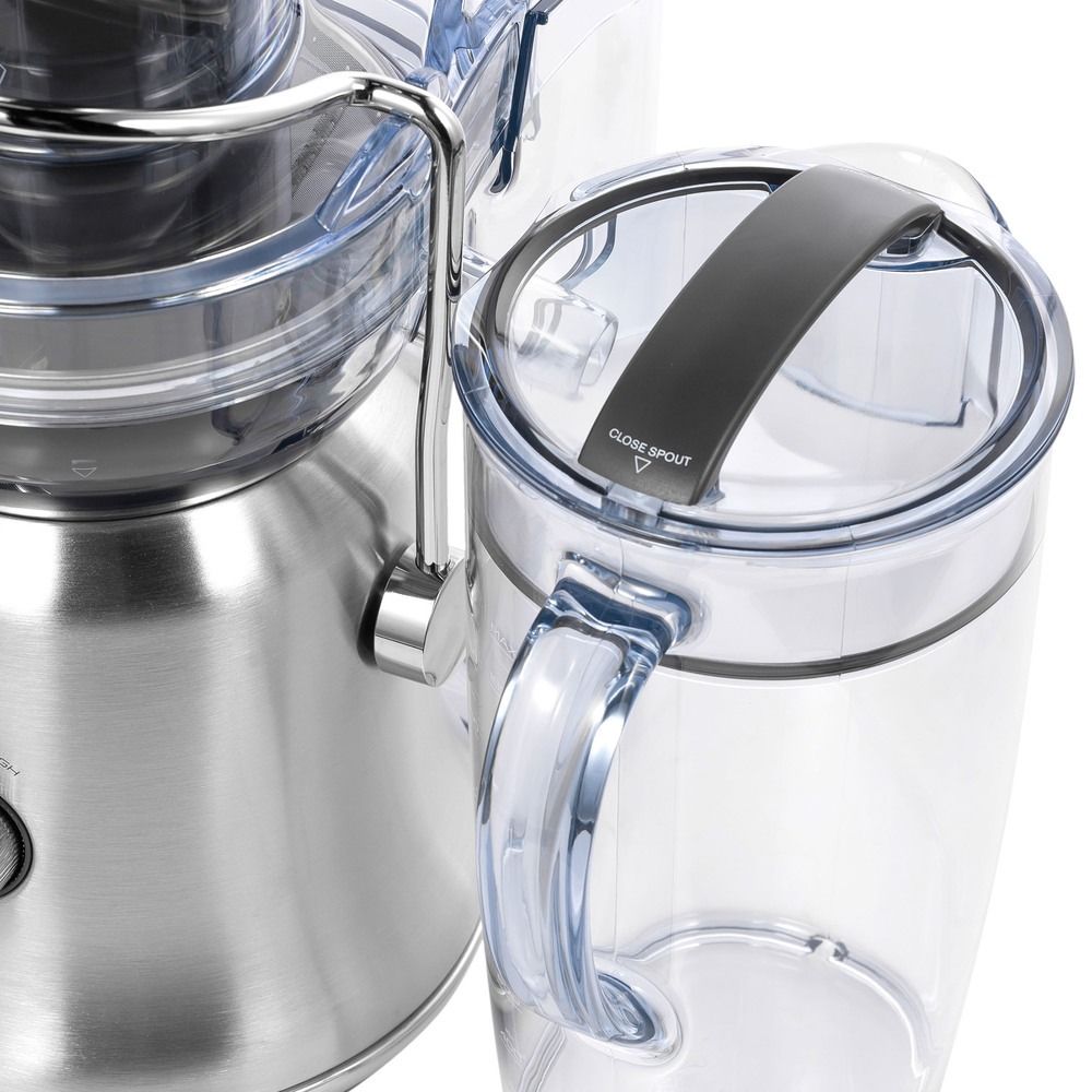 Удобная конструкция. Корпус из нержавеющей стали и устойчив к царапинам и сколам. Контейнер для жмыха располагается за основанием корпуса, а кувшин для сока слева.