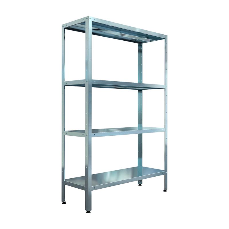 Изделие выполнено из уголка 40x40 мм оцинкованной стали, полки - из нержавеющей стали AISI 430. Модель оснащена 4 регулируемыми по высоте полками, усиленными ребрами жесткости.