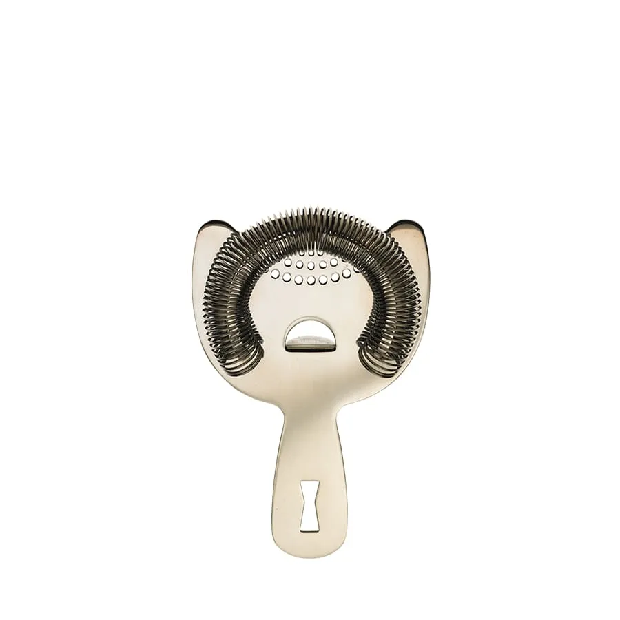 Стрейнер выполнен из хромоникелевой стали. Оснащен ручкой с отверстием на конце, пружиной и 2мя выступами для более плотного прилегания к стенкам шейкера, стакана и других емкостей для смешивания.