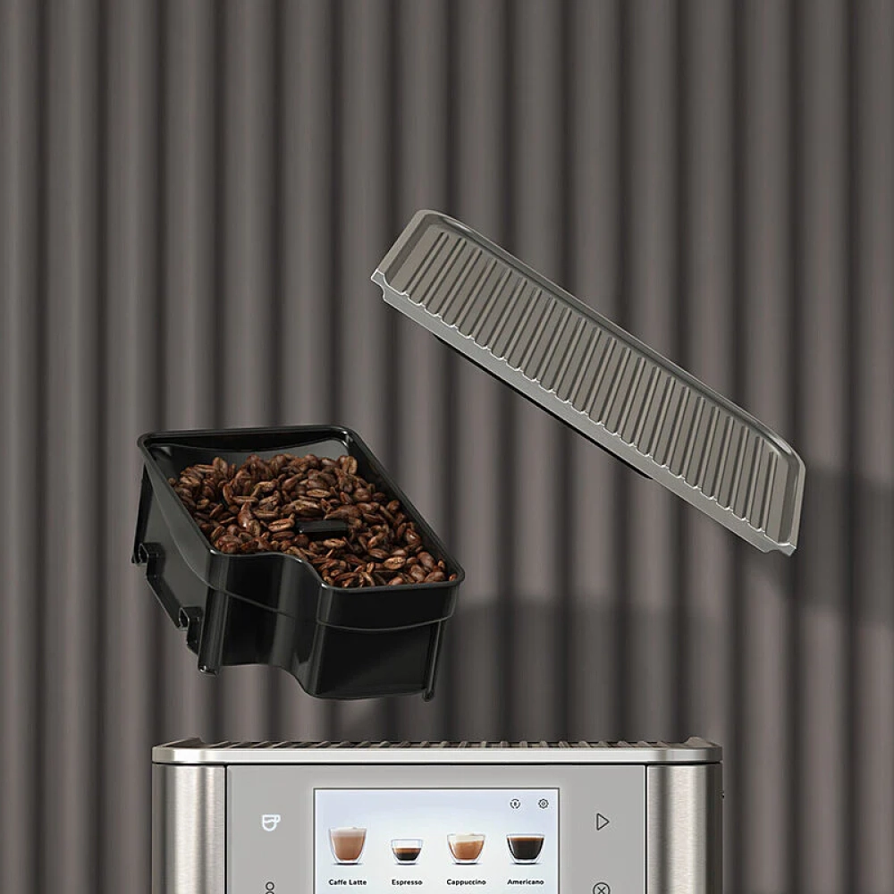 - удобная замена зёрен: съёмный контейнер (270 г) позволяет быстро сменить сорт кофе, а функция Auto Purge удаляет остатки в жерновах перед каждым помолом;