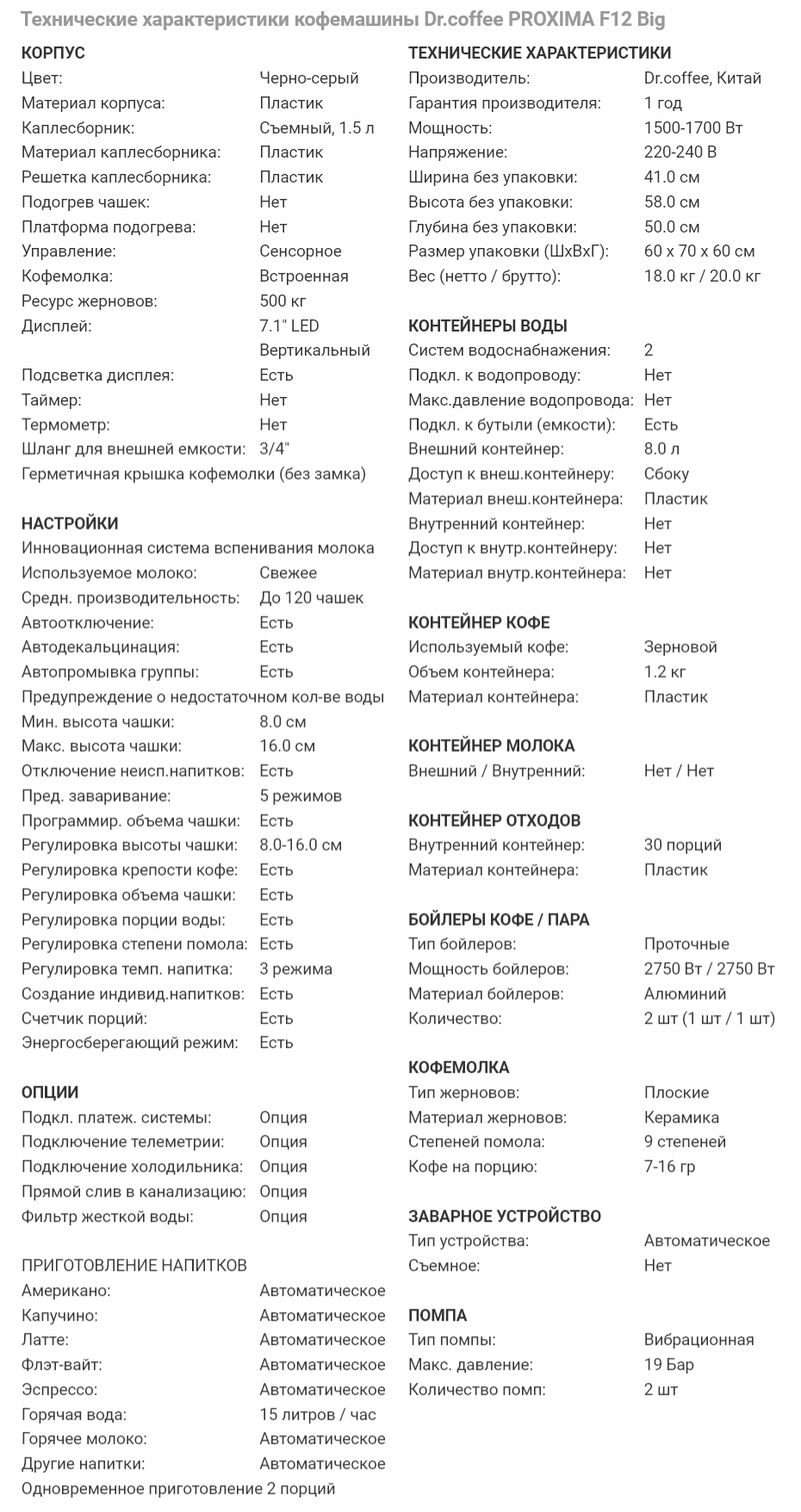 Кофемашина F12 Big производства Dr.coffee Proxima (Китай) - профессиональная суперавтоматическая кофемашина, применяется на предприятиях общественного питания, в кафе, офисах, столовых и фастфудах, подходит для любого коммерческого использования. Предназначена для приготовления различных видов кофе.