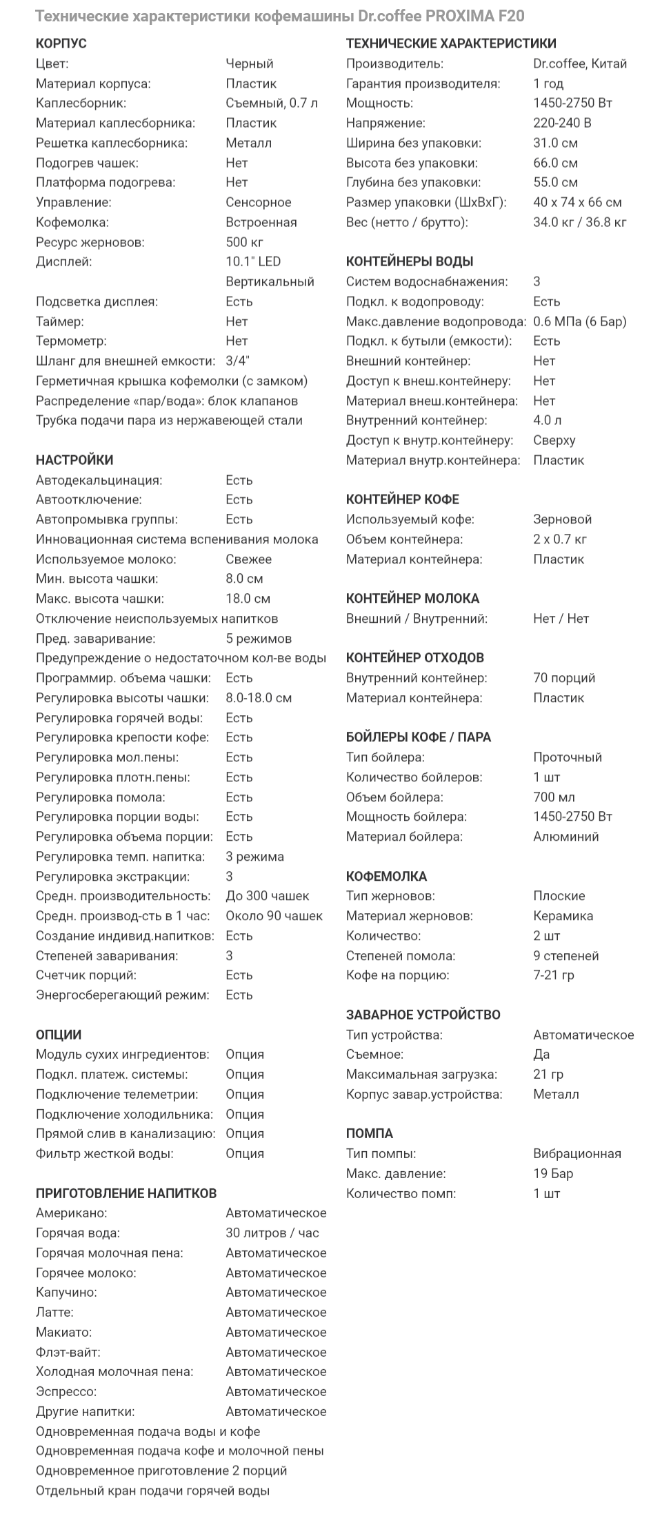 Кофемашина F20 производства Dr.coffee Proxima (Китай) - профессиональная суперавтоматическая кофемашина, применяется на предприятиях общественного питания, в кафе, офисах, столовых и фастфудах, подходит для любого коммерческого использования. Предназначена для приготовления различных видов кофе.