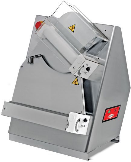 Корпус аппарата и детали, соприкасающиеся с продуктами, выполнены из нержавеющей стали. Есть возможность регулировки толщины на раскатываемого теста.