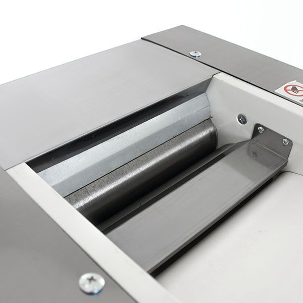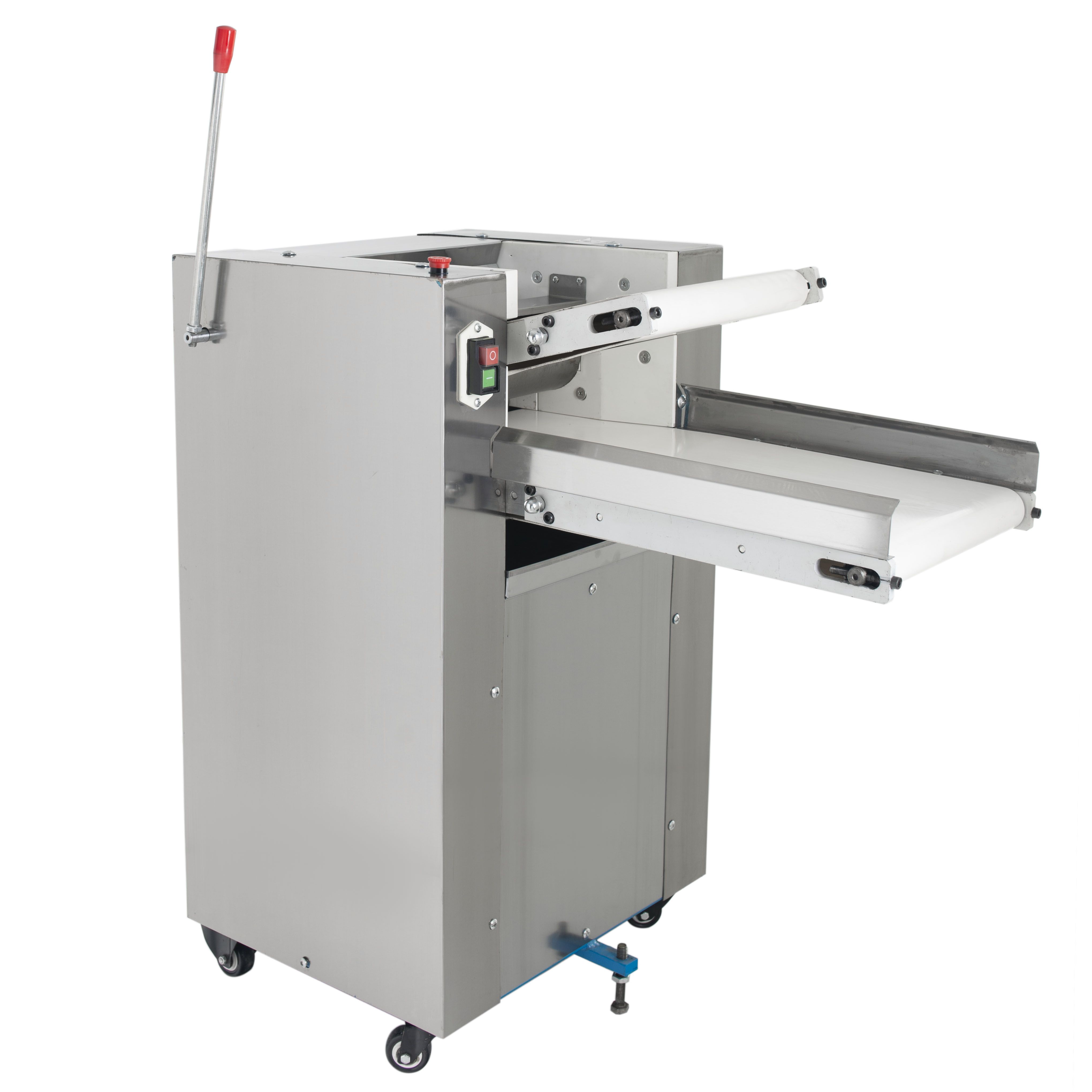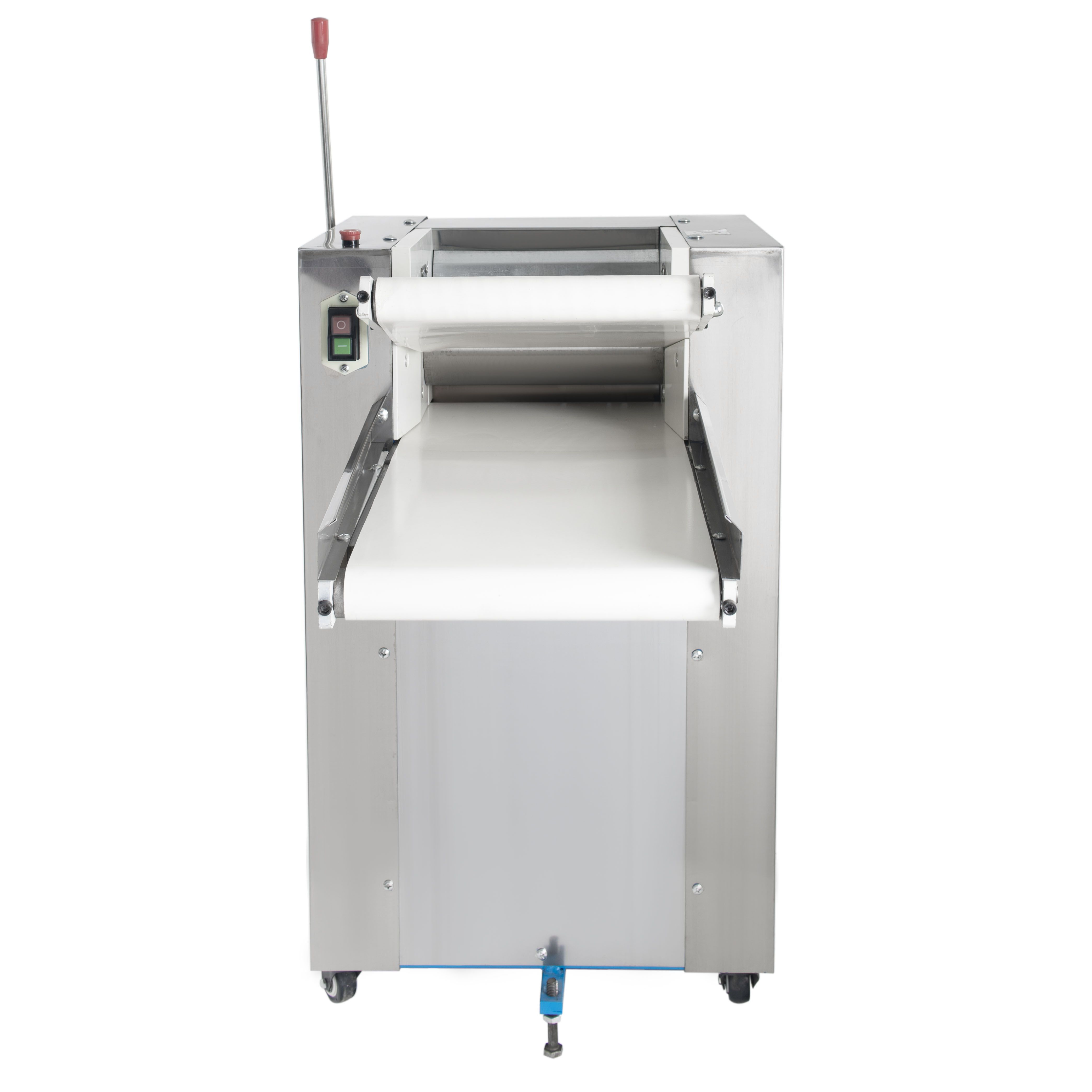 Тестораскаточная машина состоит из блока трансмиссии, блока конвейерной подачи и складывания, блока раскатки теста.