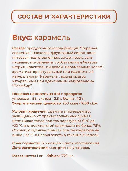 Состав: продукт молокосодержащий «Варёная сгущенка», глюкозно-фруктозный сироп, вода питьевая подготовленная, сахар-песок, соль пищевая, консерванты сорбат калия и бензоат натрия, краситель пищевой «Карамельный колер», ароматизатор натуральный или идентичный натуральному «Карамель», ароматизатор натуральный или идентичный натуральному «Пломбир».