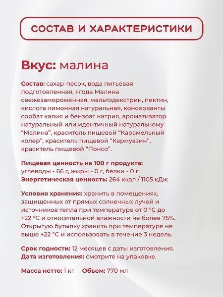 Состав: сахар-песок, вода питьевая подготовленная, глюкозо-фруктозный сироп, ягода малина, концентрированный сок «Малина», пектин, кислота лимонная натуральная, ароматизатор натуральный или идентичный натуральному «Малина», краситель натуральный «антоцианин», консерванты бензоат натрия и сорбат калия.