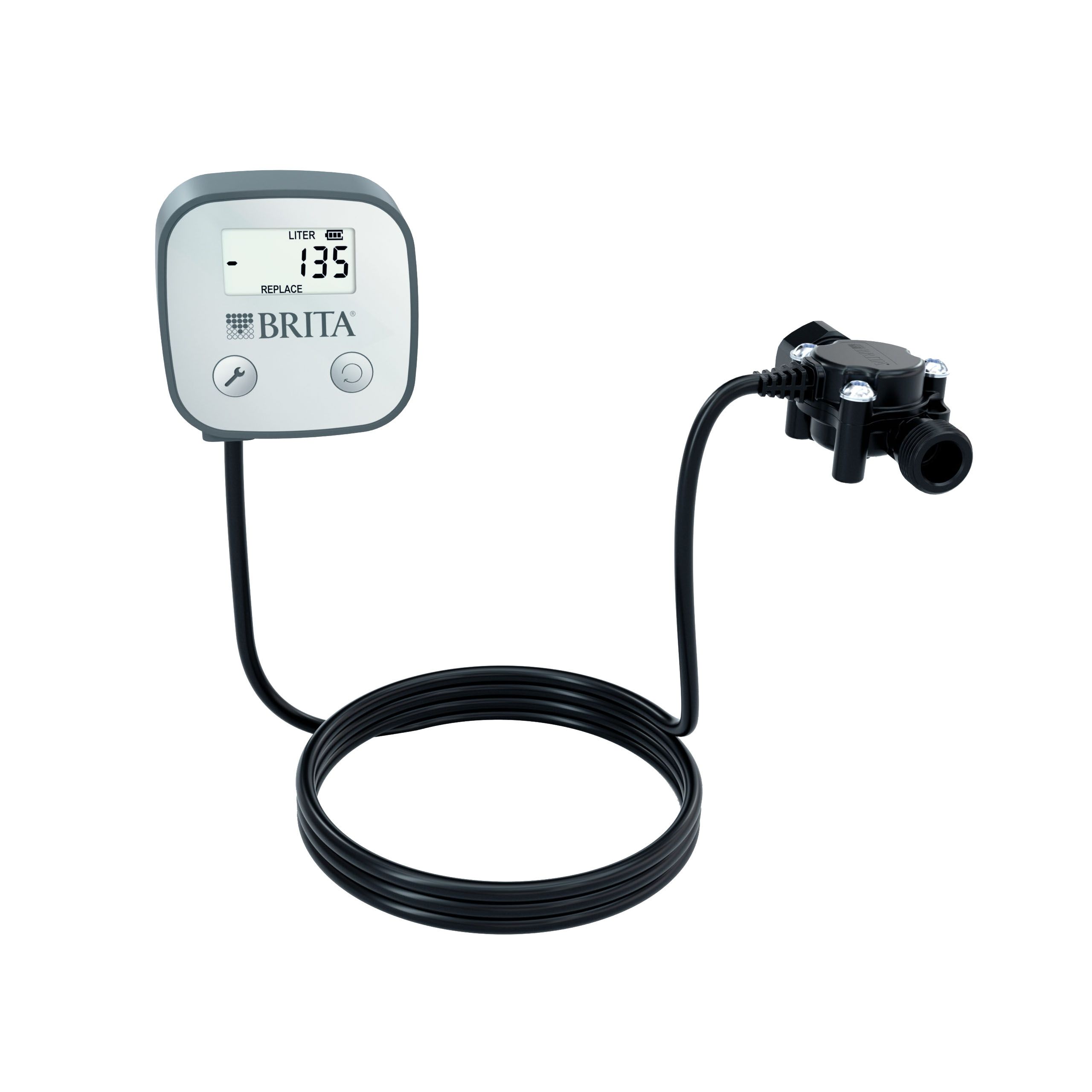 Рабочий диапазон измерения расхода воды счетчиком BRITA FlowMeter: от 10 до 100 литров в час. Сенсор счетчика монтируется к патрубку (OUT) на головной части фильтра – выход фильтрованной воды в потребляющее оборудование.