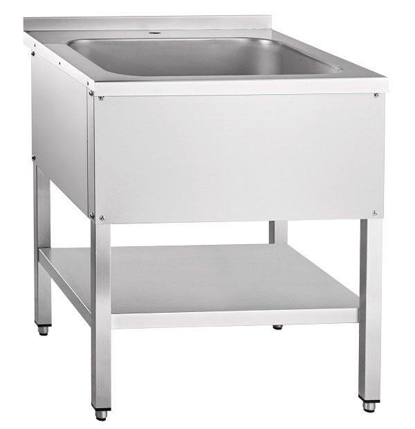 Ванна выполнена из нержавеющей стали, конструкция разборная. Оснащена одной цельнотянутой ванной, защитным бортиком, полкой, регулируемыми ножками и сифоном для слива.