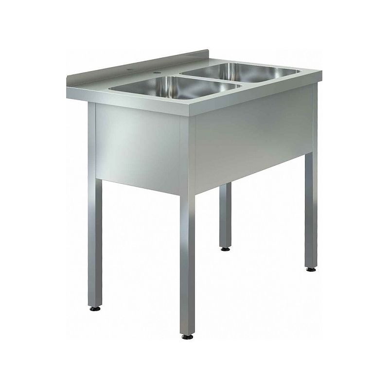 Цельнотянутая раковина выполнены из высококачественной нержавеющей стали AISI 304, столешница – из нержавеющей стали AISI 430, сварной каркас – из профиля трубы квадратного сечения из нержавеющей стали AISI 430, подпятники опор – из прочного пластика. Модель оснащена 2 раковинами, фартуком с 3 сторон, бортом, отверстием под смеситель и выпуском.