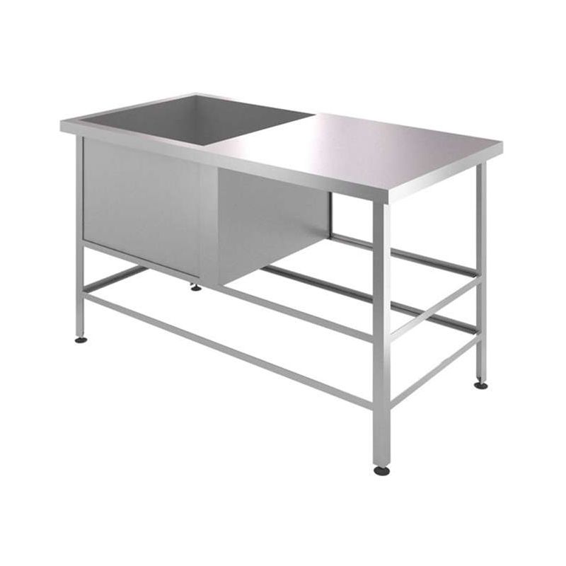 Изделие выполнено из оцинкованной стали, сварной каркас – из углового профиля, нижняя обвязка с 4 сторон – из профиля из оцинкованной стали, сварная раковина – из нержавеющей стали AISI 430, столешница – из нержавеющей стали AISI 430, подпятники опор – из прочного пластика. Модель оснащена 1 раковиной слева и рабочей поверхностью справа.